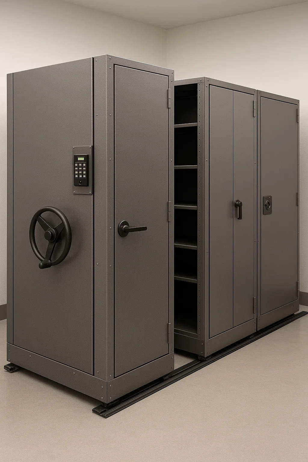 Optymalizacja przestrzeni: wykorzystuje kompaktowe regały mobilne na szynach, eliminując stałe korytarze. Szafy przesuwają się na boki, tworząc tymczasowe korytarze dostępowe tylko tam, gdzie jest to potrzebne, maksymalizując gęstość przechowywania na metr kwadratowy.